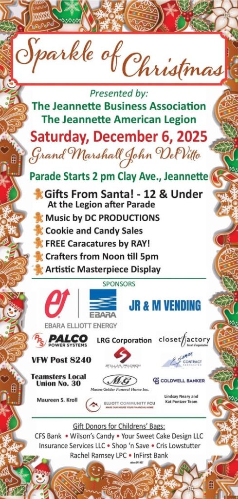 Presented by: The Jeannette Business Association and the Jeannette American Legion. Saturday, December 6, 2025. Parade starts 2pm Clay Avenue, Jeannette PA. Grand Marshall John Del […]