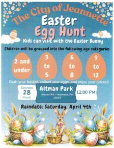 Saturday March 28, starting at 12:00pm, at Altman Park (Altman Road – Jeannette PA).