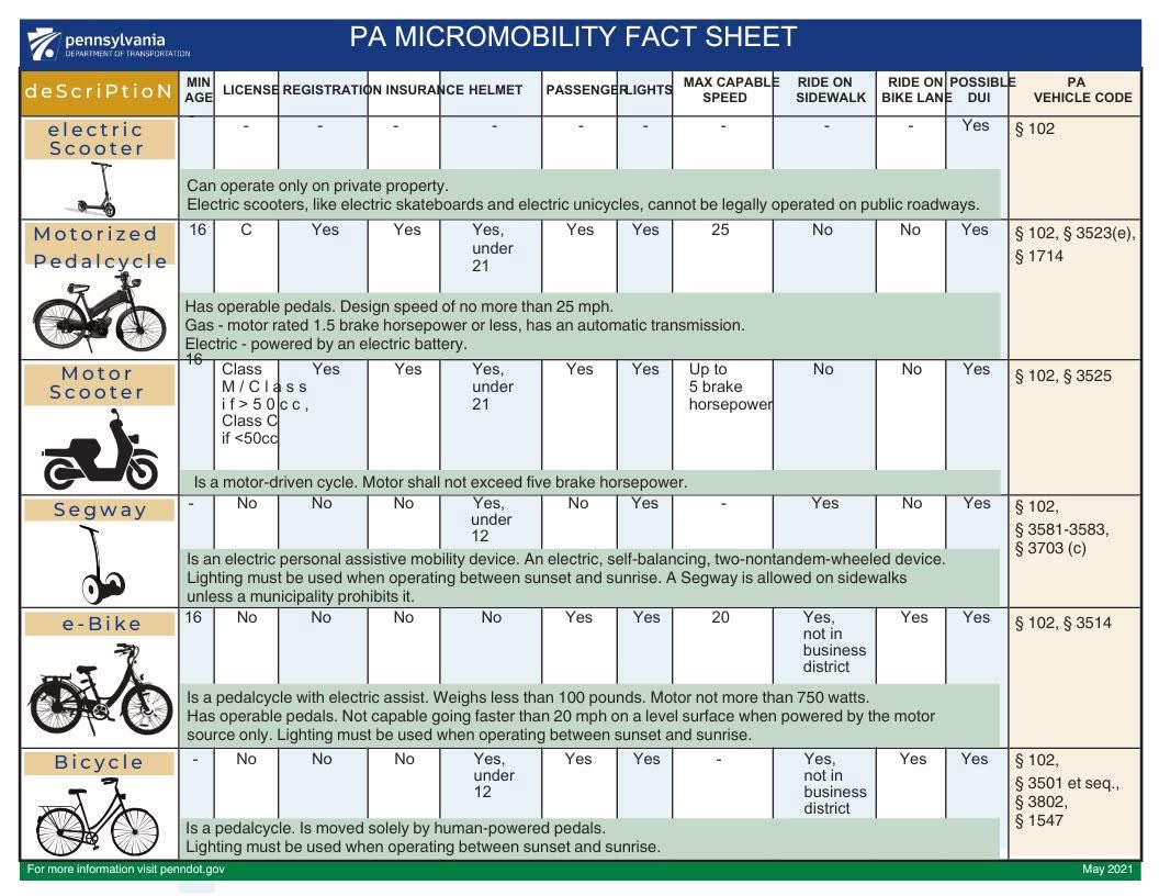 If your child plans to ride any of these, please take time to familiarize yourself with Pennsylvania laws that apply to these modes of transportation. Download the chart for guidance. Our goal is simple—a safe and enjoyable summer for all of the children in our community.